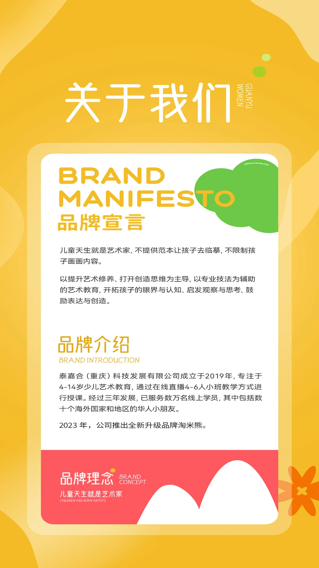 我们不是培养画家,我们也不是教他成为未来的艺术家的个体.我们系统通过淘米熊的教育理念,让孩子在十年后,从事任何领域的工作中,都能成为具有创造性思维的这个人.