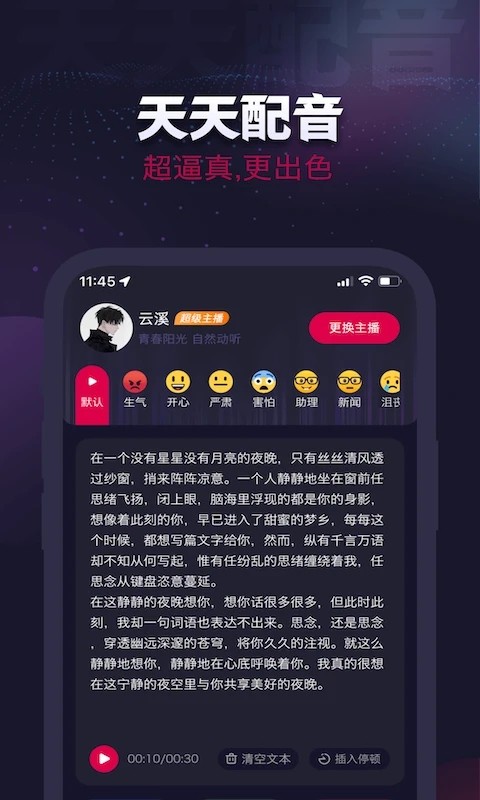 天天配音是一款功能强大的专业配音软件,为用户提供一站式智能配音解决方案。软件集成了丰富的配音素材库和先进的语音合成技术,操作界面简洁直观,即使是新手也能快速上手。无论是商业广告、有声读物还是个人视频创作,都能轻松满足不同场景的配音需求。内置上百种自然流畅的语音音色,涵盖多种方言和外语,让您的作品更具个性化。更支持多种音频格式导出,方便在各种平台使用,是内容创作者和商业用户的得力助手。