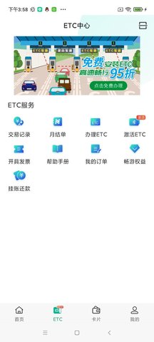 【ETC】提供ETC设备在线申请、自助安装激活一站式服务,支持储值卡欠款在线偿还和差旅费查询,省去线下办理的繁琐流程。