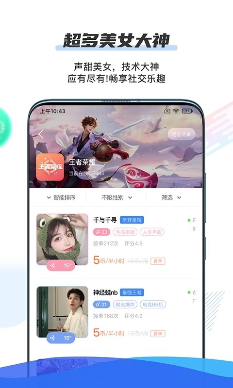 超多美女大神:平台认证的高颜值陪玩和实力大神任你选择,多样化的社交体验让游戏更有趣