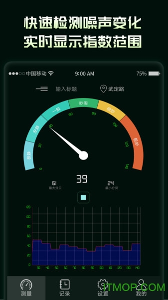 2、实时显示当前环境的噪声分贝值,观察波形图可知道噪声的变化。波形图采用不同颜色区分安全、注意、危险三个等级,直观易懂。