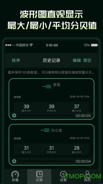 4、可随时播放之前保存的声音测量记录,判断测量结果。支持添加备注标签,方便后续查找和对比不同时间段的噪音数据。