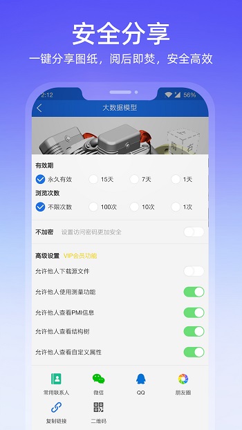 可以将手机或电脑本地的3D模型和CAD图纸一键分享给他人,提供【公开】和【加密】两种分享方式,满足不同安全级别的分享需求。