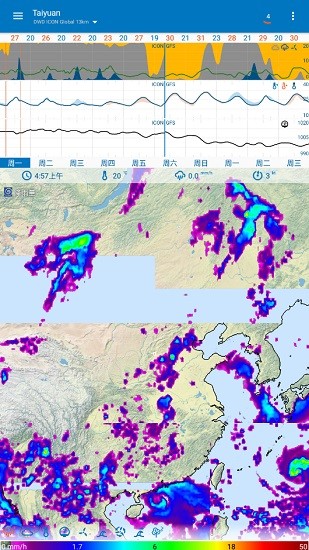 交互式贴图功能:通过手指滑动即可控制预测动画的时间轴变化,您还可以选择叠加显示多个数据层,如结合风流线的降水云图,让天气分析更加全面。