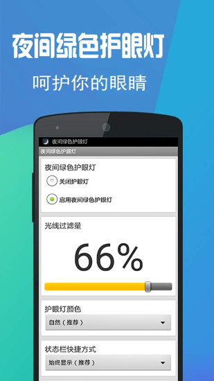 夜间绿色护眼灯app是一款专为夜间使用手机的用户设计的健康护眼工具。如今,许多人习惯在睡前关灯后躺在床上刷手机,但这种行为会导致屏幕强光与黑暗环境形成强烈对比,长期如此可能引发眼睛干涩、疲劳,甚至造成视力下降或近视加深等问题。夜间绿色护眼灯通过智能调节屏幕色温和光线强度,有效减少手机屏幕对眼睛的刺激,为用户提供更舒适的夜间用眼体验。