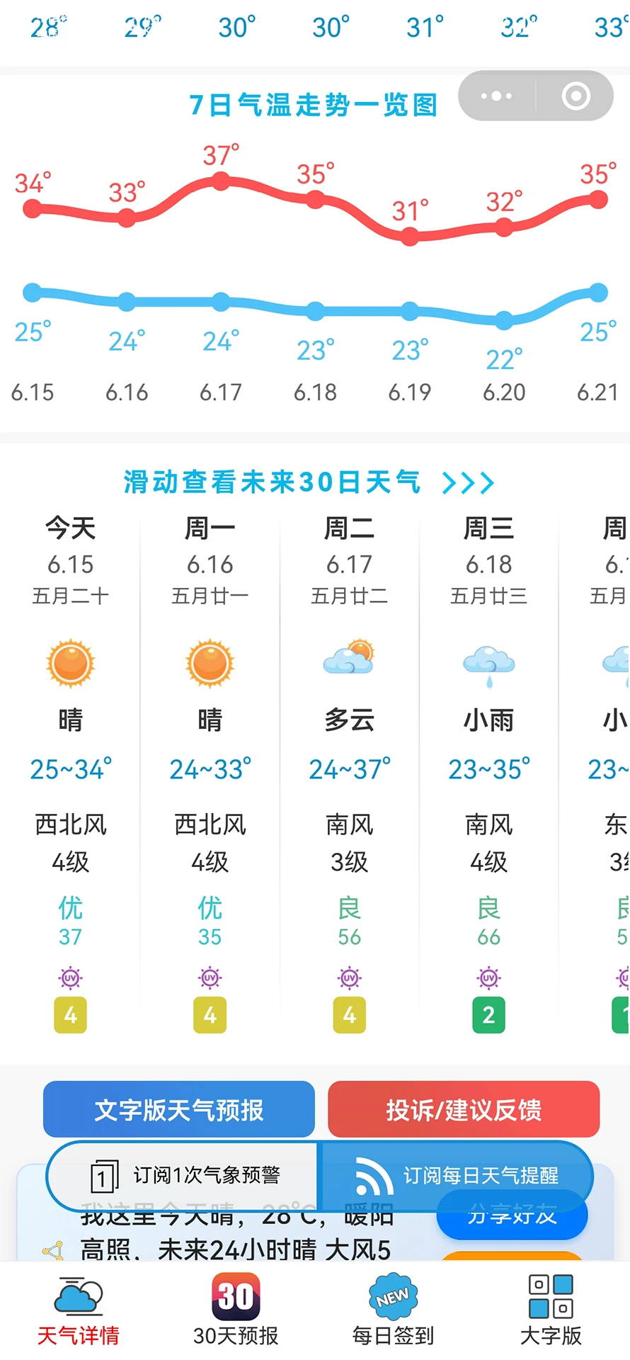 "天气预报吧"APP为用户提供当前定位城市及手动选择城市的实时天气情况、未来7天、30天预测,以及分钟级降水提醒、小时级天气情况预报,实时空气质量及未来7天空气质量预测、体感温度、风向、风力、紫外线指数、历史天气、生活指数等。
