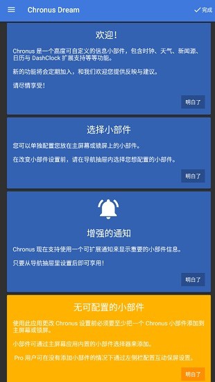此外,Chronus还内置了RSS新闻订阅功能,用户可以通过Pocket实现“稍后阅读”功能。软件支持备份和恢复小部件设置,方便用户在不同设备间同步配置。在flex和dash小部件中,用户可以添加任意两个DashClock扩展,进一步提升使用体验。Chronus还兼容智能手表,并提供了基本的Chronus Wear表面支持,同时可以在CyanogenMod、LineageOS等ROM中作为天气提供商使用。
