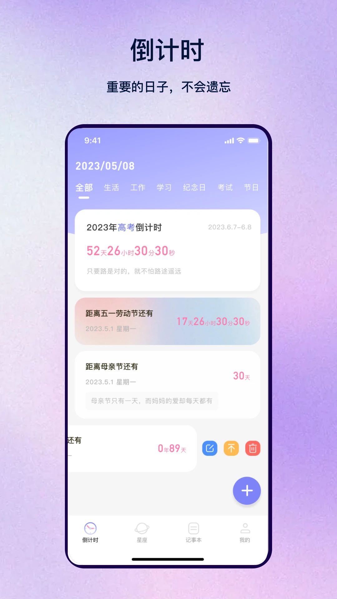 倒计时可用于记录:考试倒计时、生日提醒、节假日倒计时、各种纪念日、情侣恋爱天数、生命倒计时等等。星座分析:新鲜有趣的星座运势测算大全和情感运势专家,全面解析你的每日星座运势,提供丰富的星座配对和心理测试,给你幸福指引,把握十二星座运势前程!