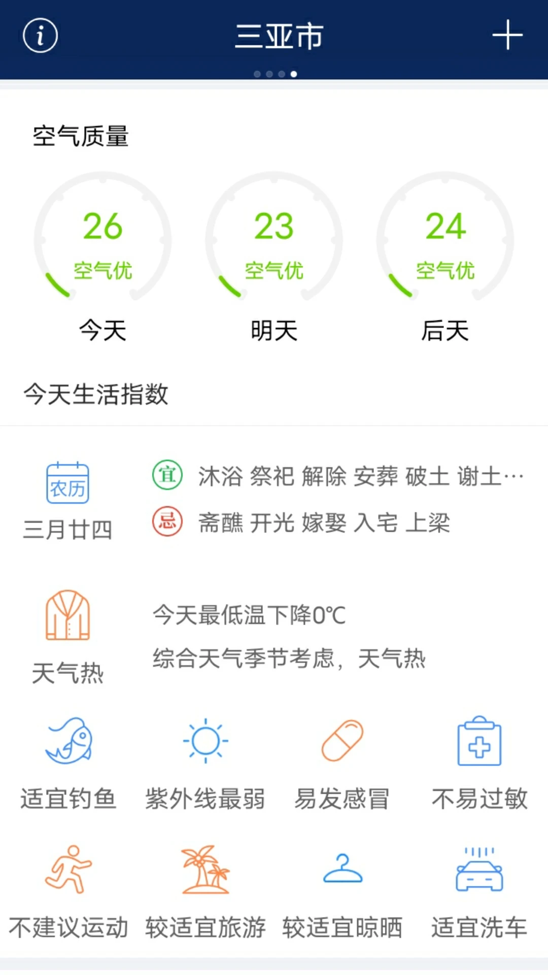 天气预报信息准确全面,可实时预报分钟级天气预报,让您精准知晓几分钟后下雨?几分钟后雨停?几分钟后适合出门?精准预报未来24小时预报、未来72小时天气、预报未来7天、10天、15天天气预报等天气信息;气压、湿度、能见度是您户外钓鱼的好帮手!空气质量、空气污染指数、温度趋势变化、pm2.5、空气质量指数等更加丰富,让您轻松出行,不惧雾霾。提供穿衣指数、紫外线指数、感冒指数、洗车指数等生活指数,实时更新预报,懂你美好生活!