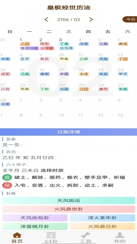 皇极经世历法是一款融合传统历法与易经卦象推演的专业工具,以北宋理学家邵雍的《皇极经世》为核心理论框架,为用户提供跨越116年(1990-2106)的精准卦象查询服务。它不仅整合了农历、二十四节气、六十甲子等传统历法元素,更独创性地将六十四卦与时间维度结合,可回溯过去35年、展望未来80年的每日卦象变化。这款工具通过"运卦、世卦、旬卦、年卦、月卦、日卦"六层时空模型,让使用者能够从多维角度理解时间与卦象的对应关系,既是研究易学文化的数字宝典,也是现代人探索传统智慧的实用指南。