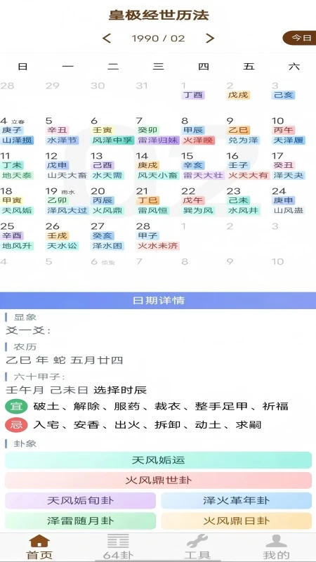皇极经世历法是一款集传统历法与卦象推演于一体的专业工具,以邵雍的《皇极经世》为内核,完美结合农历、节气、六十甲子、六十四卦,为用户提供精准的卦象信息。卦象覆盖了1990年2月4日至2106年2月3日的116年,从当下可以看过去35年,看未来80年,每一天都精确给出了对应的运卦、世卦、旬卦、年卦、月卦、日卦。
