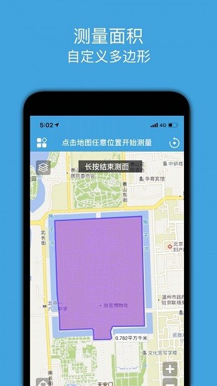 在地图上自定义绘制任意多边形测量面积。支持多种单位制式切换,包括公制、英制等,满足不同用户的测量习惯。