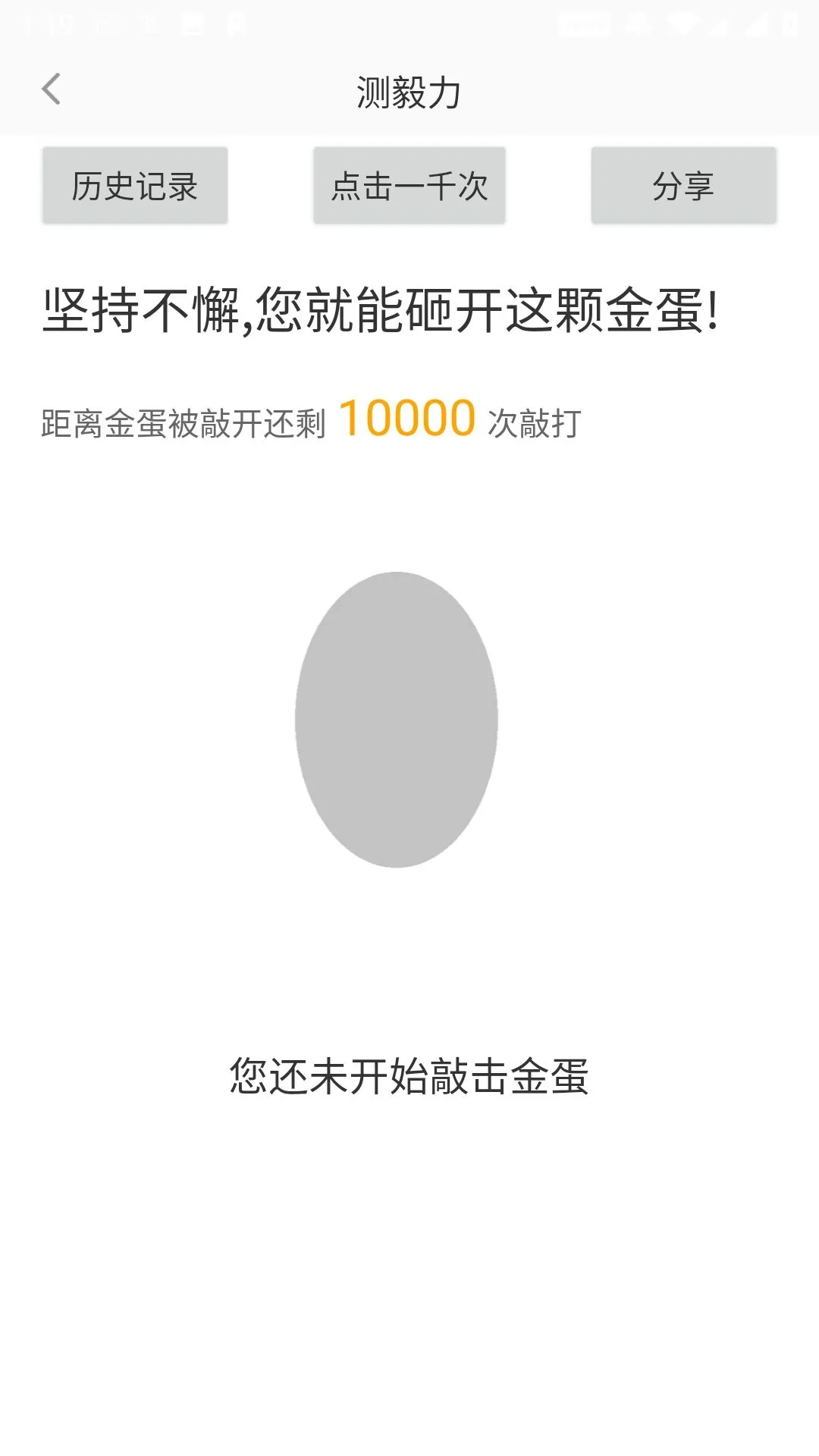 测毅力:测毅力模块主要用来考察你的毅力。金蛋共需要一万次敲击才会破开。