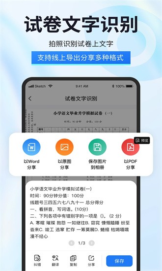 通过拍照或上传试卷图片,能够识别试卷内容并将其转换为可编辑的文本格式,方便用户进行批注、摘录等操作。支持多种输出格式,包括Word、PDF等,满足不同场景下的使用需求。