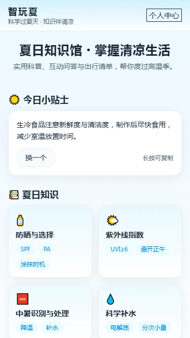 陪你智慧应对酷暑的平台是一款专为夏季健康生活设计的智能助手,致力于为用户提供全方位的防暑降温解决方案。无论是科学防暑知识、饮食健康建议,还是个性化出行清单,都能在这里轻松获取。平台还通过趣味问答形式普及高温天气和雷雨防护知识,帮助用户安全度过炎炎夏日。从防晒补水到应急物品准备,陪你智慧应对酷暑的平台让您的夏天更清凉、更安心。
