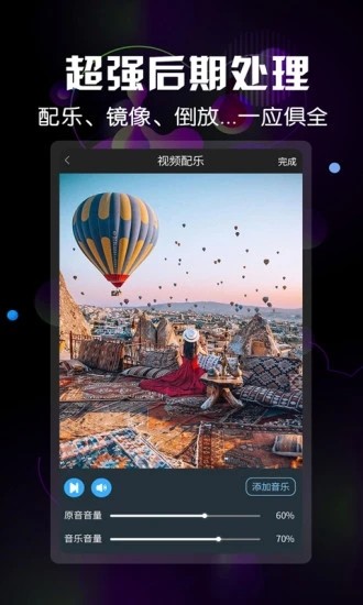 视频添加配乐,当下更流行的歌曲这里都有,直接添加成视频背景音乐,支持音量调节和淡入淡出效果。