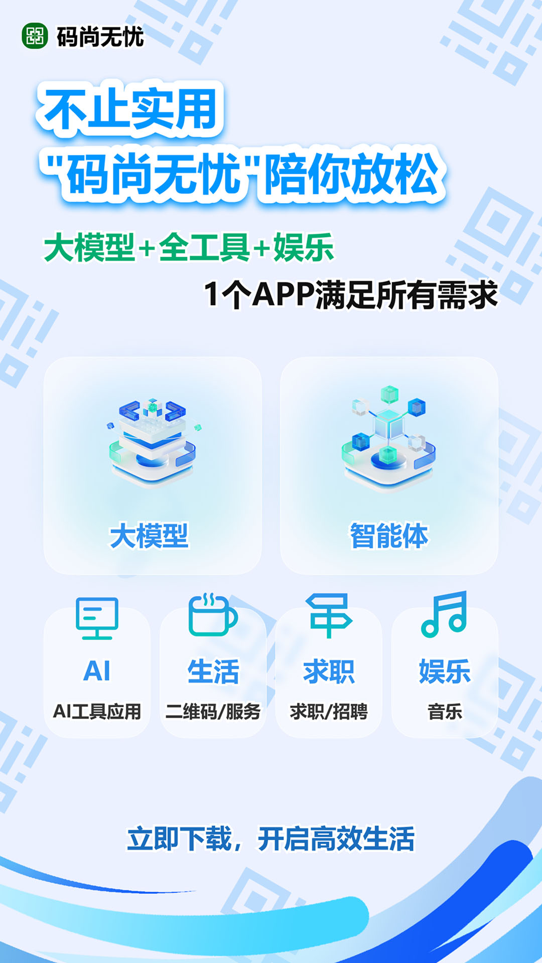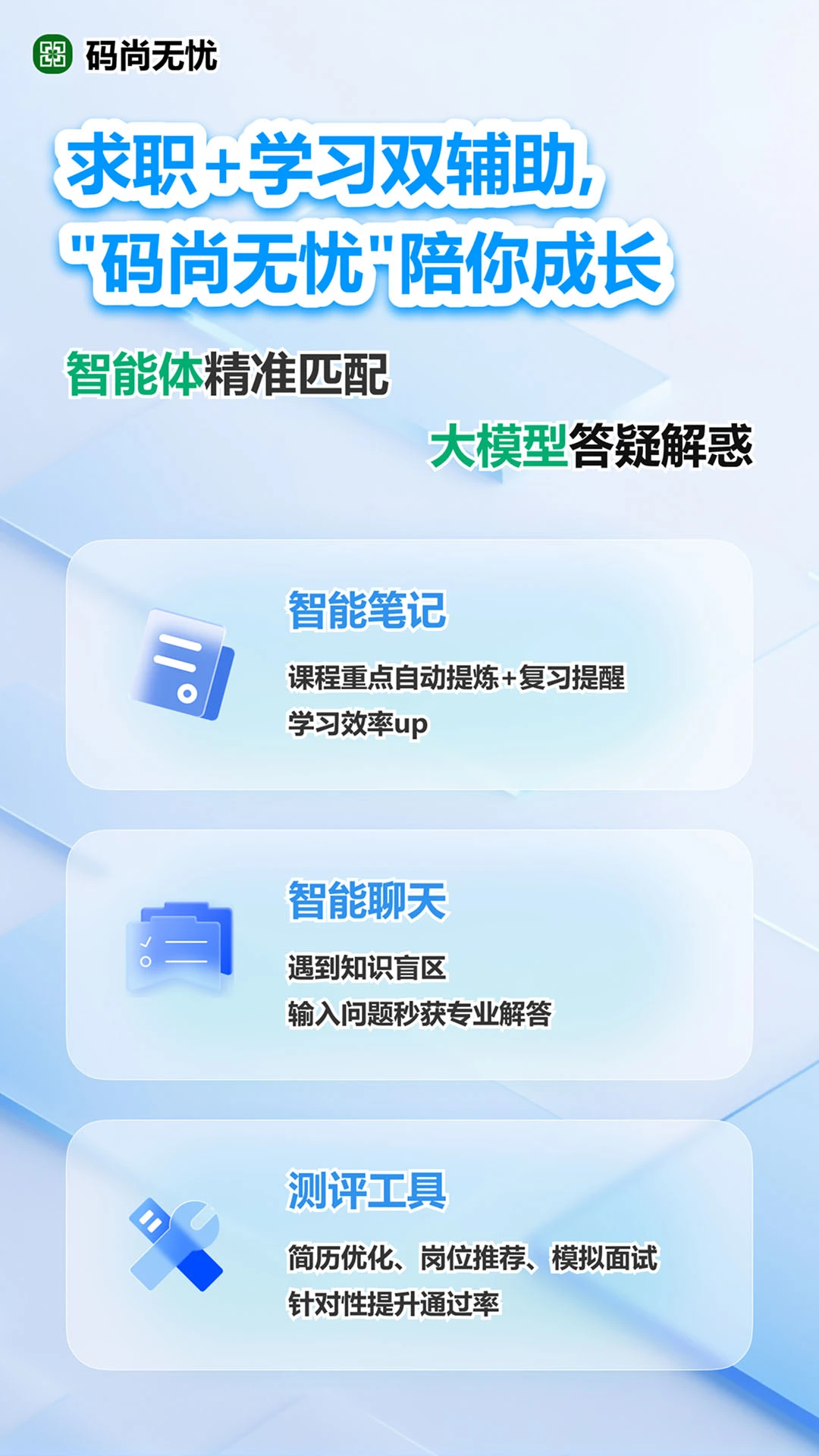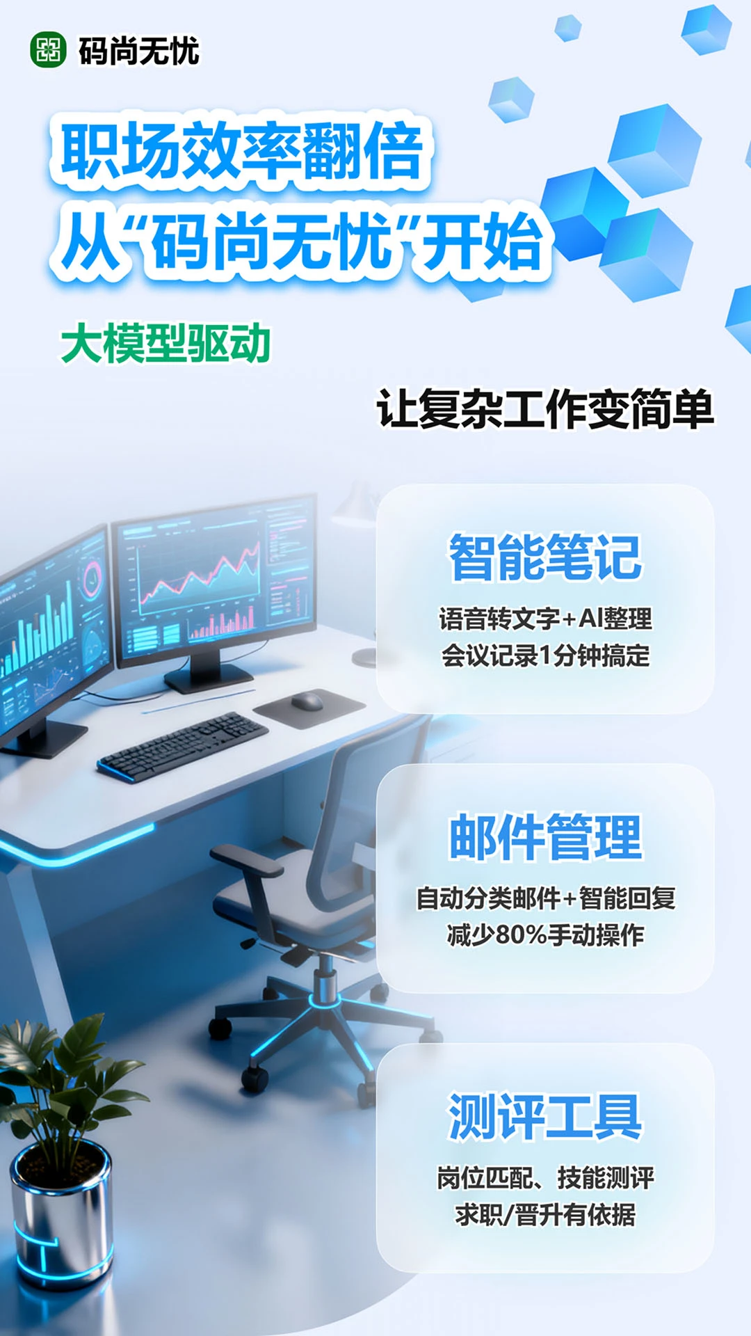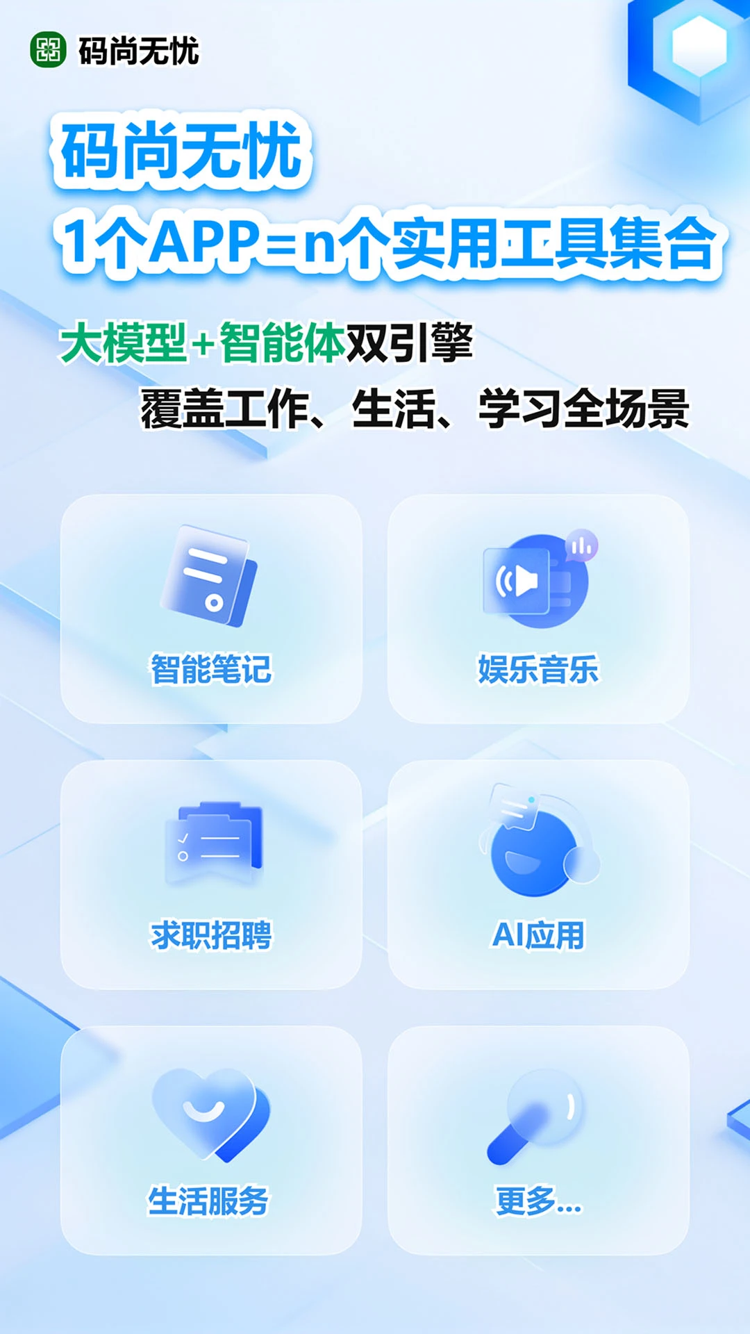 码尚无忧是一款集成大模型与智能体双引擎的全能APP,以“1个APP=n个实用工具”为核心,覆盖工作、生活、学习全场景,打造高效便捷的综合服务体验。工作场景中,智能笔记可语音转文字+AI整理会议记录,还能提炼学习重点并提醒复习;邮件管理自动分类+智能回复,减少80%手动操作;测评工具提供岗位匹配、简历优化、模拟面试等服务,助力求职晋升。