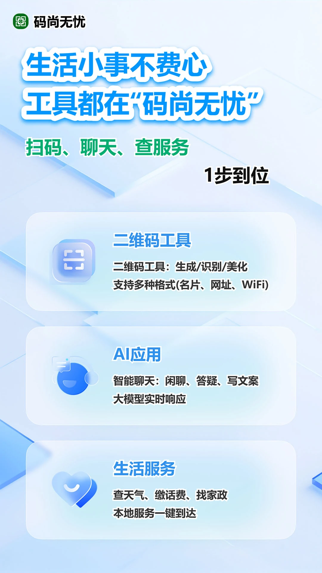 生活场景里,二维码工具支持生成、识别、美化多种格式二维码;AI智能聊天可闲聊、答疑、写文案;生活服务能一键查天气、缴话费、找家政。同时还有娱乐音乐服务供用户休闲。