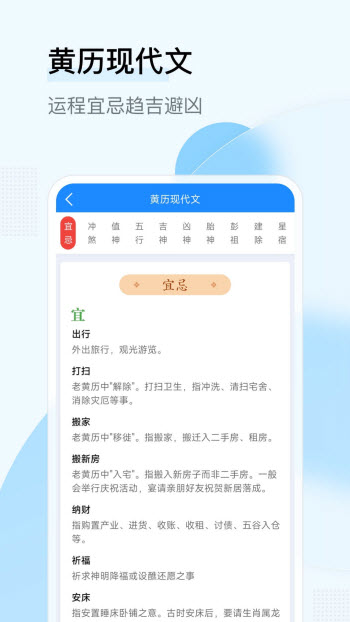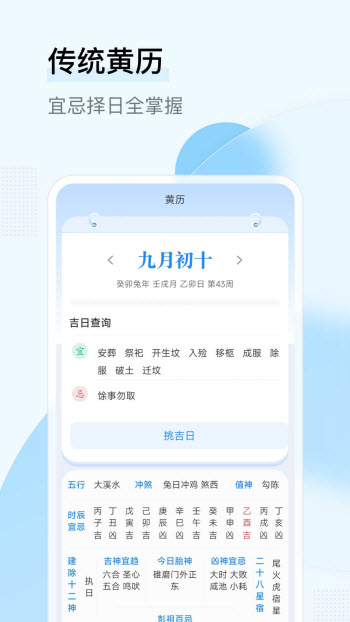 实时更新农历禁忌和生肖吉日查询:最新的农历禁忌和生肖吉日查询功能,让用户准确掌握日常禁忌和生肖吉日,从而更明智地规划自己的生活安排和工作时间。此外,软件还会根据用户的使用习惯推荐适合的吉日,帮助用户更好地安排重要活动。