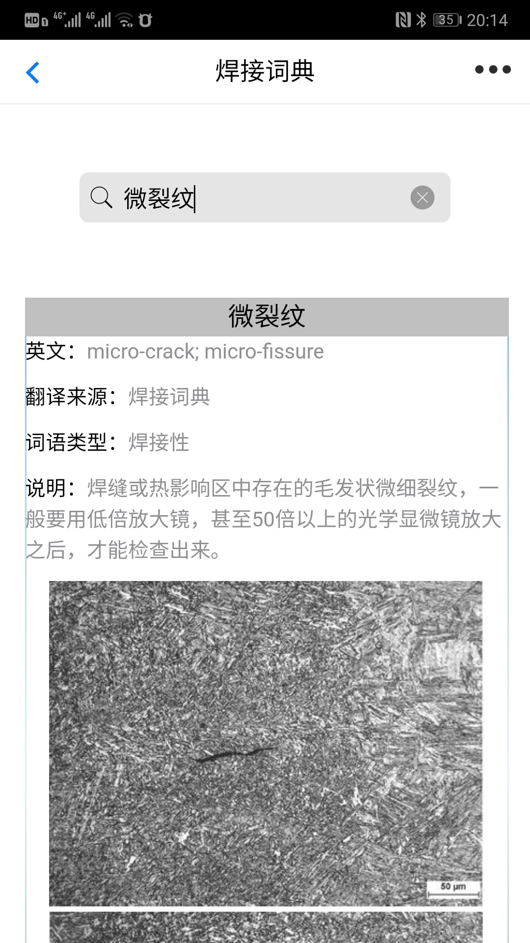 焊接词典:提供上万条焊接词汇、金属词汇、热处理词汇的中英文对照,还有示意和图例,简介易懂,它囊括了新版《焊接词典》,数十个国内外标准术语解析;