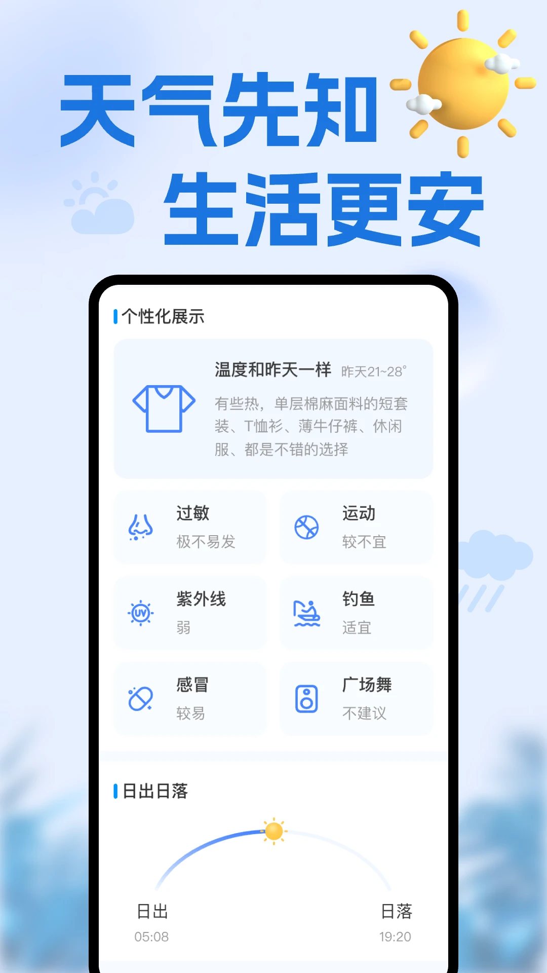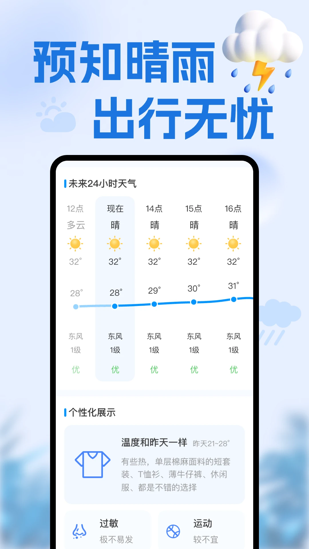 天气通是一款功能强大的天气查询应用,致力于为用户提供精准、实时的天气信息服务。无论是日常生活还是出行规划,天气通都能满足您的需求。通过每分钟更新的天气数据,您可以随时掌握全球数万个城市的天气状况,包括未来15天的天气预报、空气质量监测以及灾害天气预警等。此外,生活指数的贴心提示,如紫外线指数、穿衣指数等,让您的每一天都更加轻松便捷。智能推送功能还能根据天气变化及时提醒您,确保您不会错过任何重要信息。快来下载天气通,体验智能天气服务带来的便利吧!