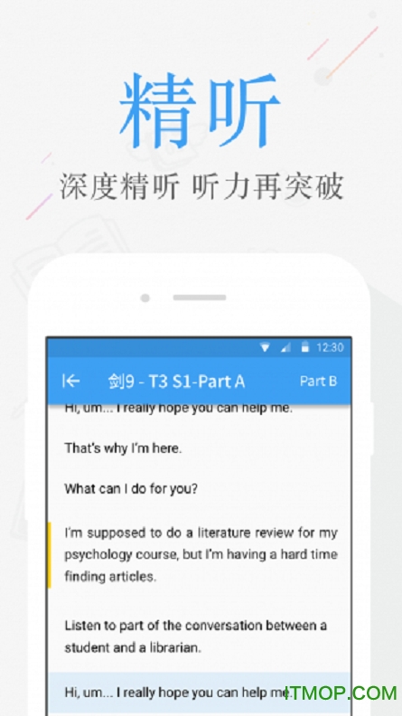 软件采用剑桥雅思原版听力素材,支持逐句精听切分功能,配合名师总结的精听技巧,帮助用户逐步攻克听力难关。系统会自动记录用户的听力练习数据,智能分析薄弱环节,推荐针对性训练内容。