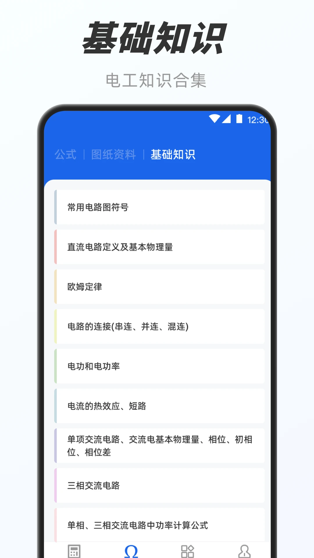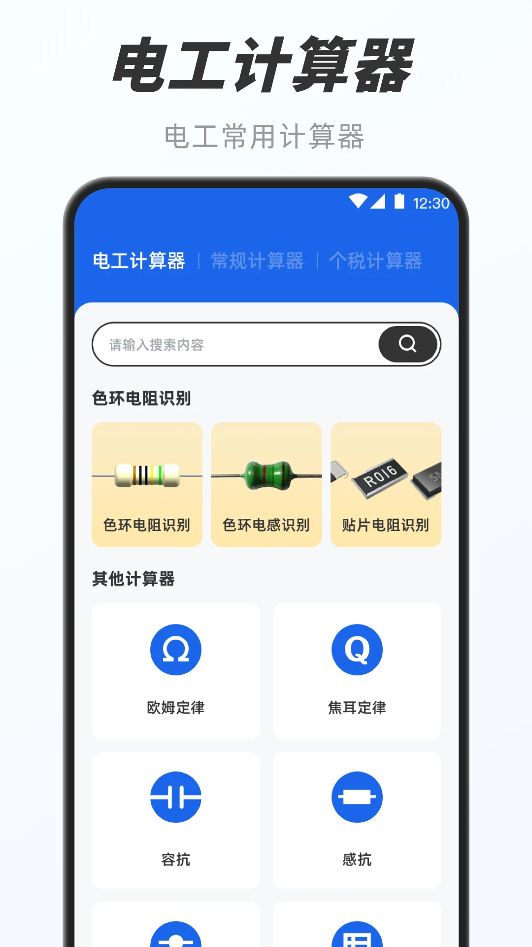 电工计算器:内置多种电工专用计算器,如色环电阻识别、欧姆定律计算等,满足不同场景需求。