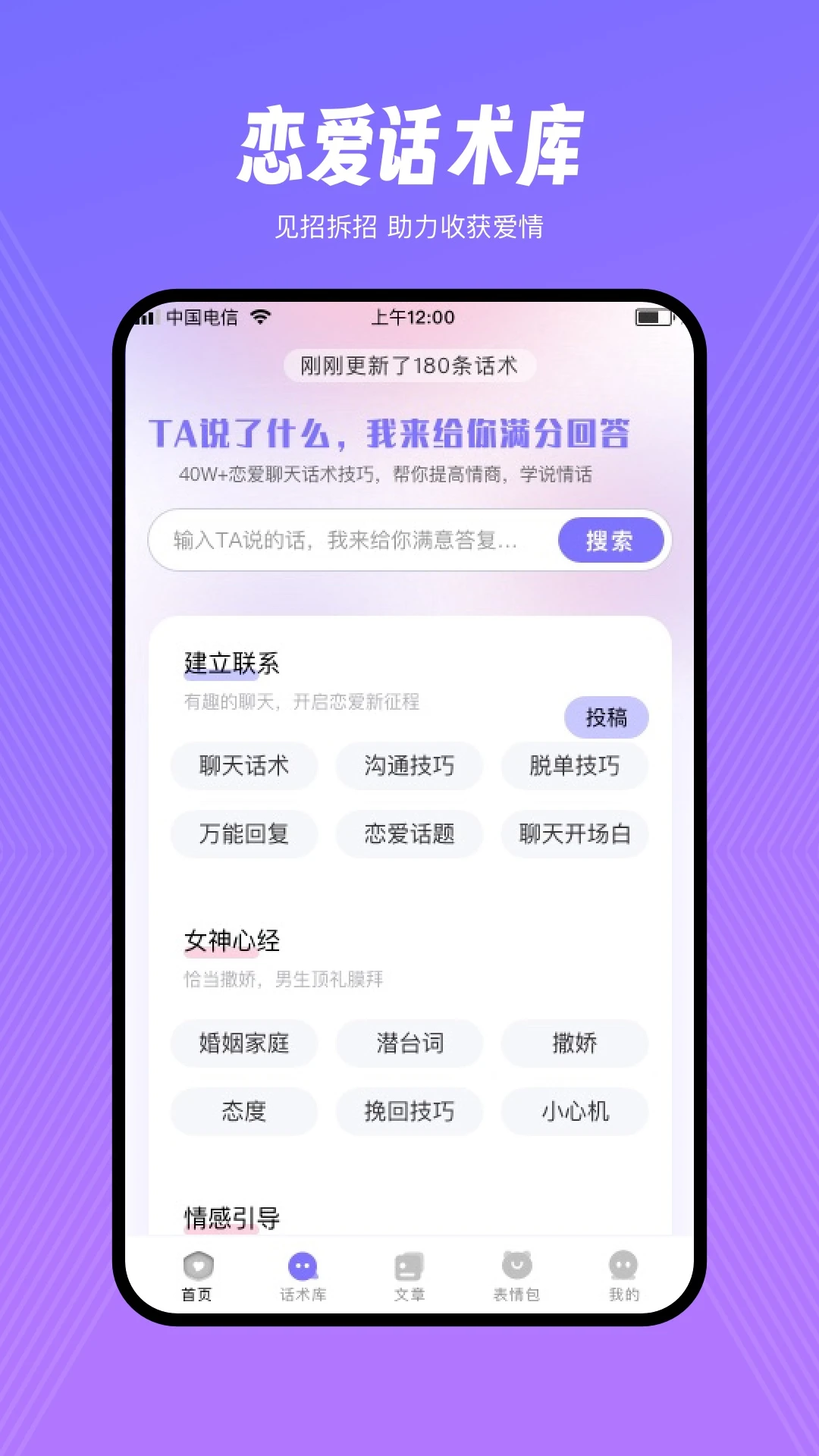 恋爱话术大全:收录数千句经过精心挑选和分类的恋爱话术,涵盖从初识到热恋各个阶段,让用户随时找到合适的表达方式。