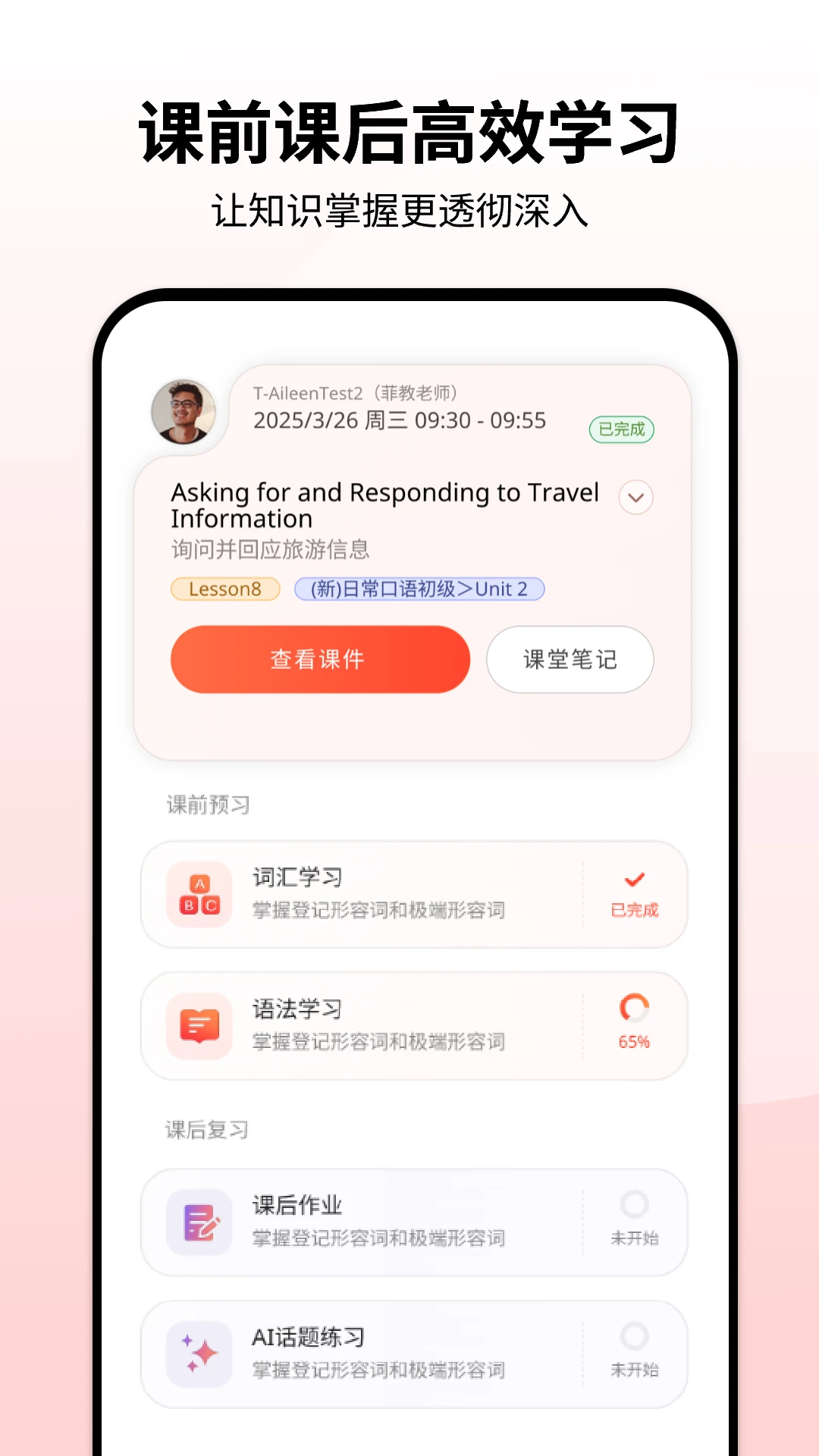 √从预约课程到学习规划,从老师选择到课后复习,为您的每一步学习提供精准服务,助您在轻松中掌握语言技能