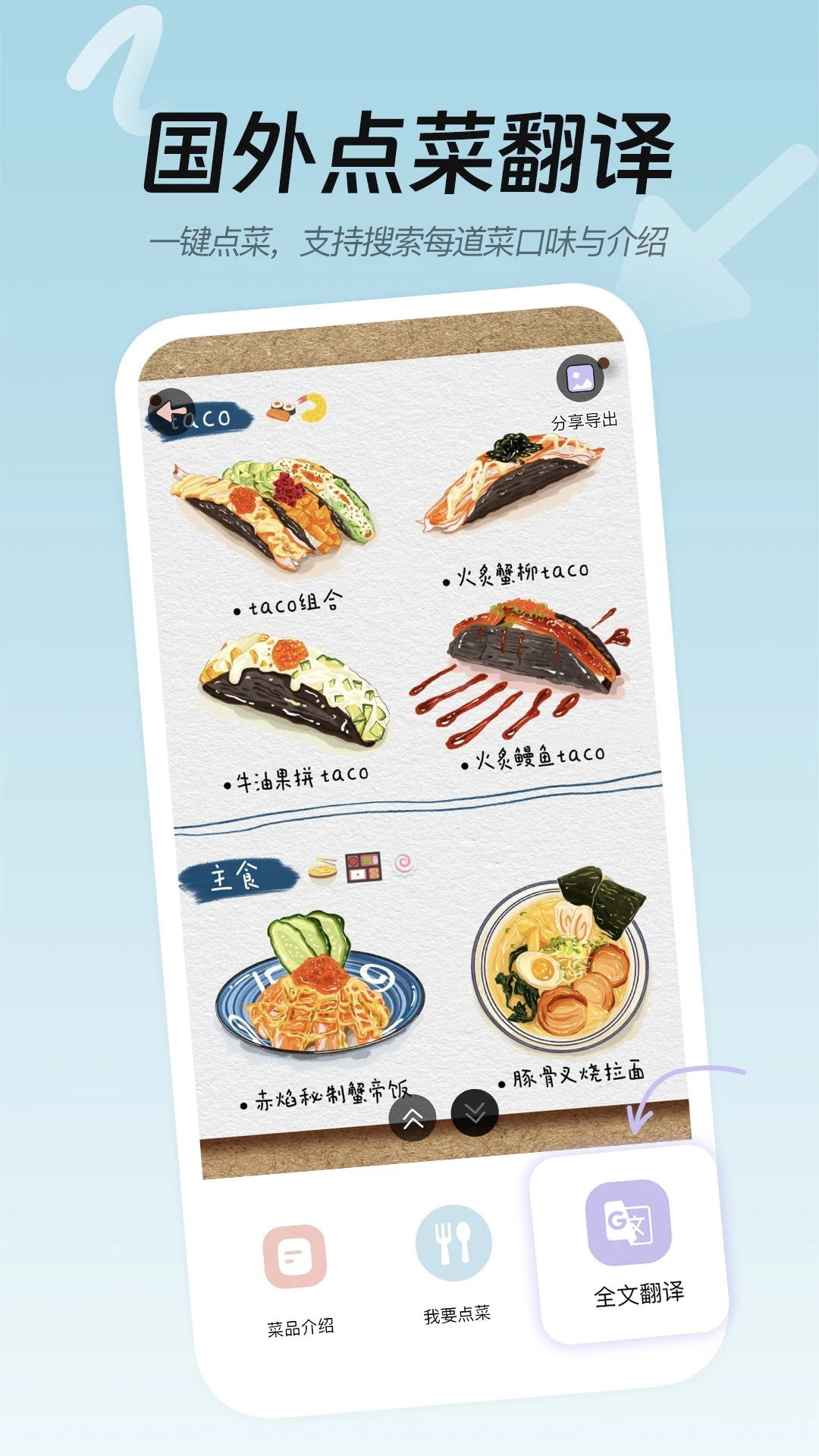 国外旅行吃饭点单、帮助您无障碍下单,还支持多语言翻译。
