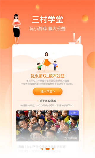 心愿:收集整理乡村学校的实际需求,用户可通过游戏学分捐助方式参与众筹,由中国平安负责心愿实现。