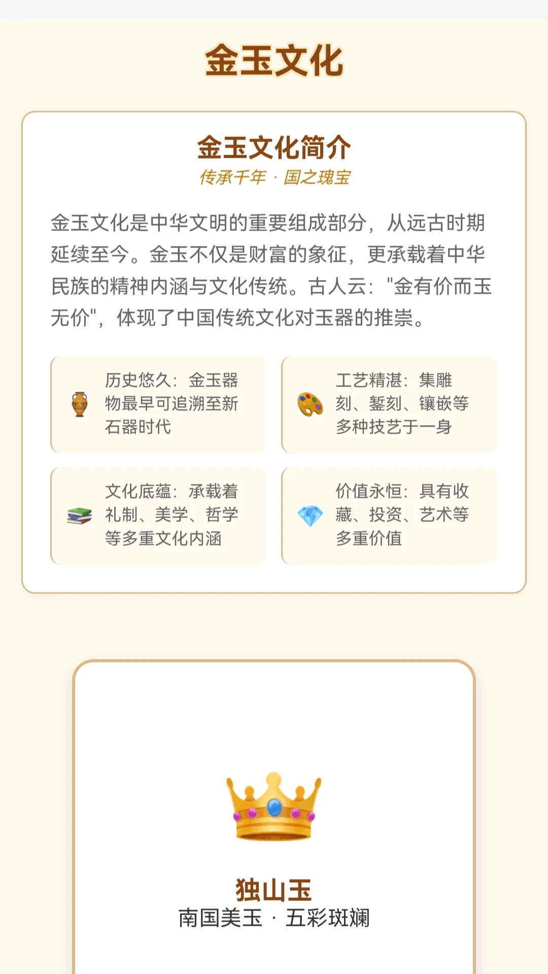 "点点金玉"是一款专注于金玉文化与人生智慧的学习平台,它将中华文明中珍贵的金玉文化与现代生活相结合,为用户提供丰富的知识内容和实用工具。平台深入挖掘和田玉的特点与价值,分享金玉良言启迪人生,同时提供黄金辨别的实用技巧,让用户在了解传统文化的同时,也能获得实际的生活指导。无论是文化爱好者、收藏家,还是寻求人生智慧的学习者,都能在"点点金玉"中找到属于自己的精神财富。
