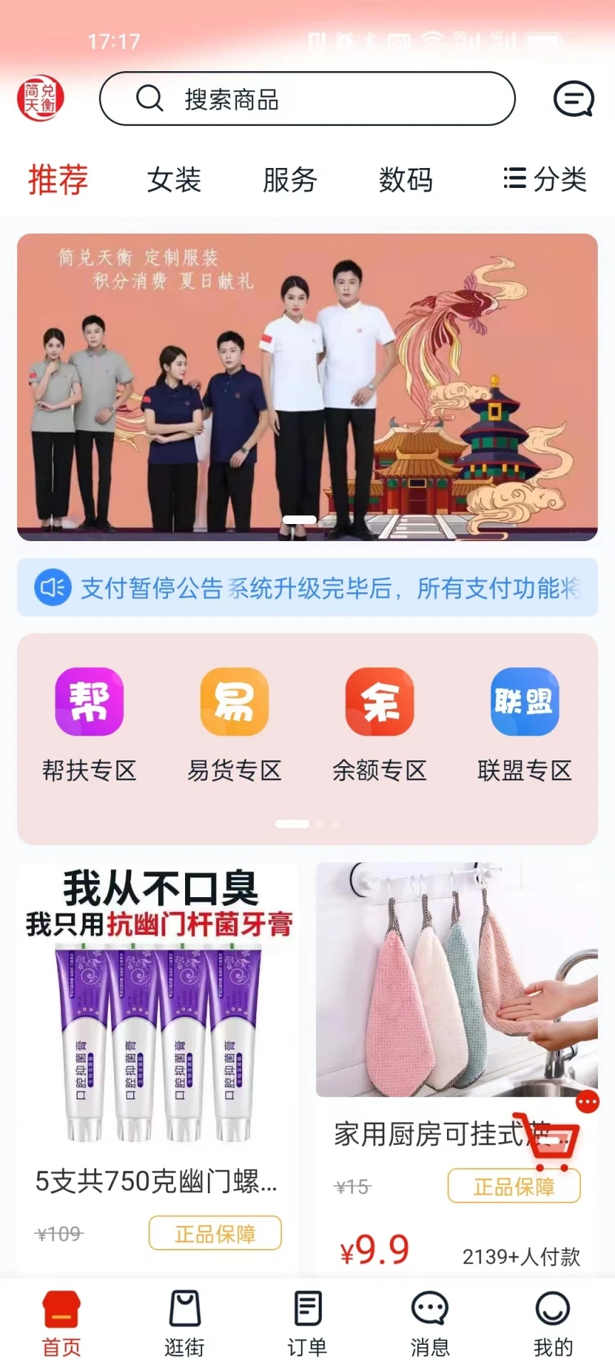 线上商城:覆盖全国商家资源,提供食品、日用品、电子产品等全品类商品,满足用户一站式购物需求。逛街功能:基于LBS定位,智能推荐周边20公里内的优质商户,支持线上预约、线下自提或到店消费。