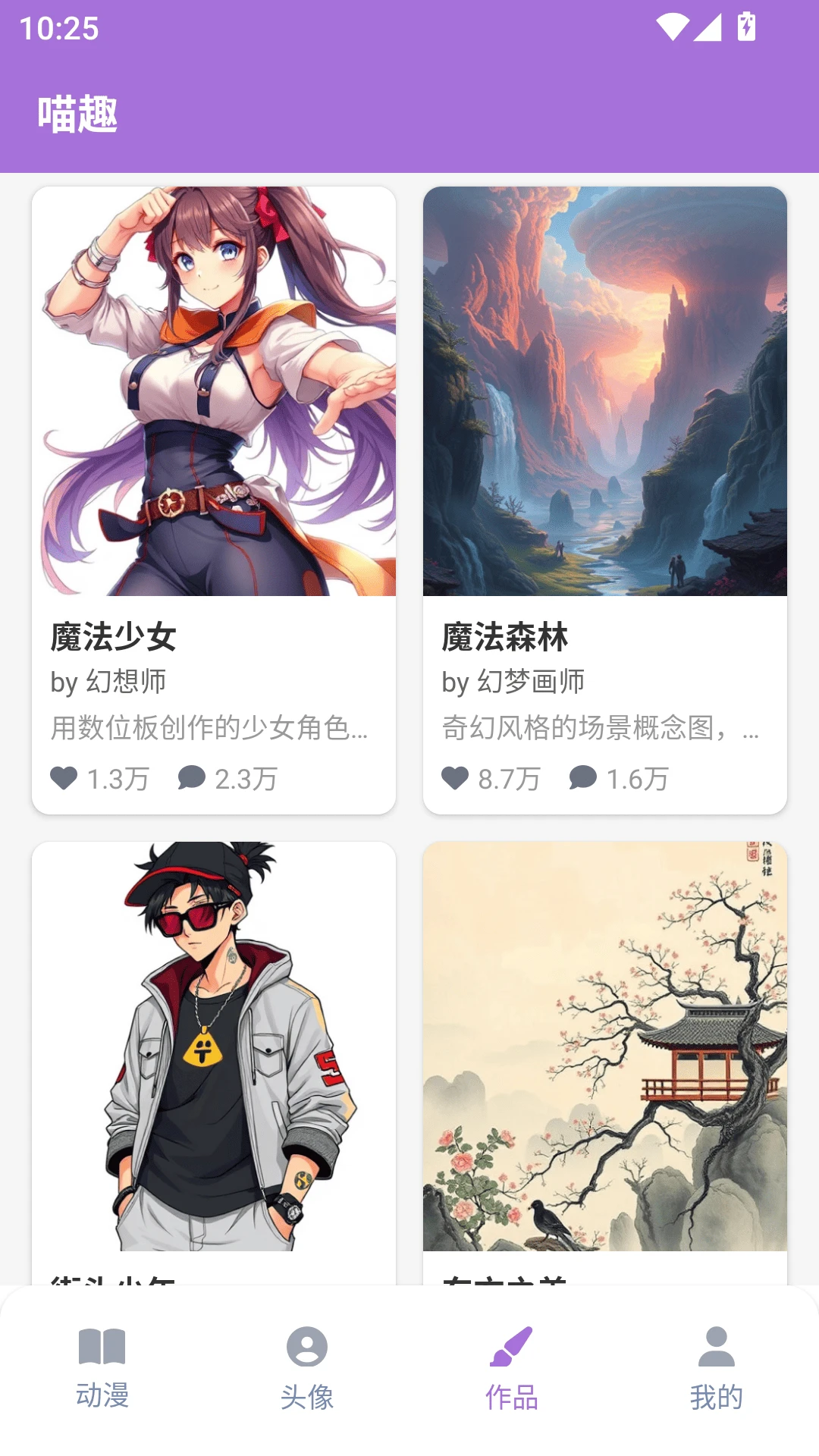 喵趣乐园是一个汇聚优质动漫视觉内容的软件,专注于提供丰富的艺术壁纸、个性头像及动漫创作资讯。用户可浏览海量高人气插画作品,涵盖魔法少女、奇幻场景等多元主题,欣赏创作者的精妙设计并获取最新艺术动态。加入喵趣,开启你的灵感探索之旅!
