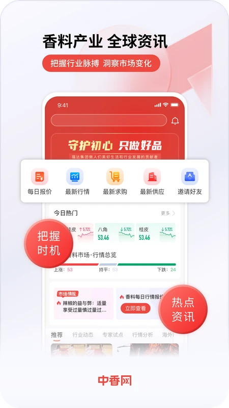 中香网APP是由福达集团投资建设并运营的B2B产业互联网电商平台,集销售、采购、仓储、物流、检测等一体化线上交易服务平台。提供行业最新最全资讯和一级香料市场价格行情资讯,并积极开展国内外香料线上大宗贸易业务。全方位满足香料行业的信息需求,致力于搭建一个优质、迅速、齐全的香料行业咨询和便捷、高效、畅通的香料供应链一站式服务平台。