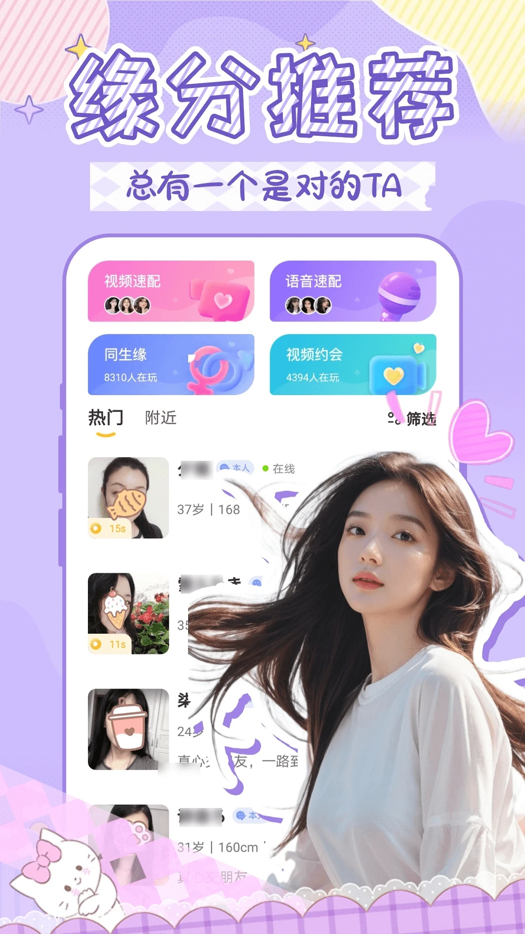 友缘同城交友约会,精准匹配同城缘分,让每一次相遇都绽放美好故事!在繁忙的都市中,我们为你搭建起一座桥梁,让你轻松跨越人海,找到那个与你心灵共鸣的TA。智能算法精准匹配,让每一次滑动都充满惊喜,同城相遇,让爱情与友情不再遥不可及。安全私密的环境,让你放心交流,享受纯粹的社交乐趣。友缘同城交友约会,让每一次相遇都成为美好故事的开始!