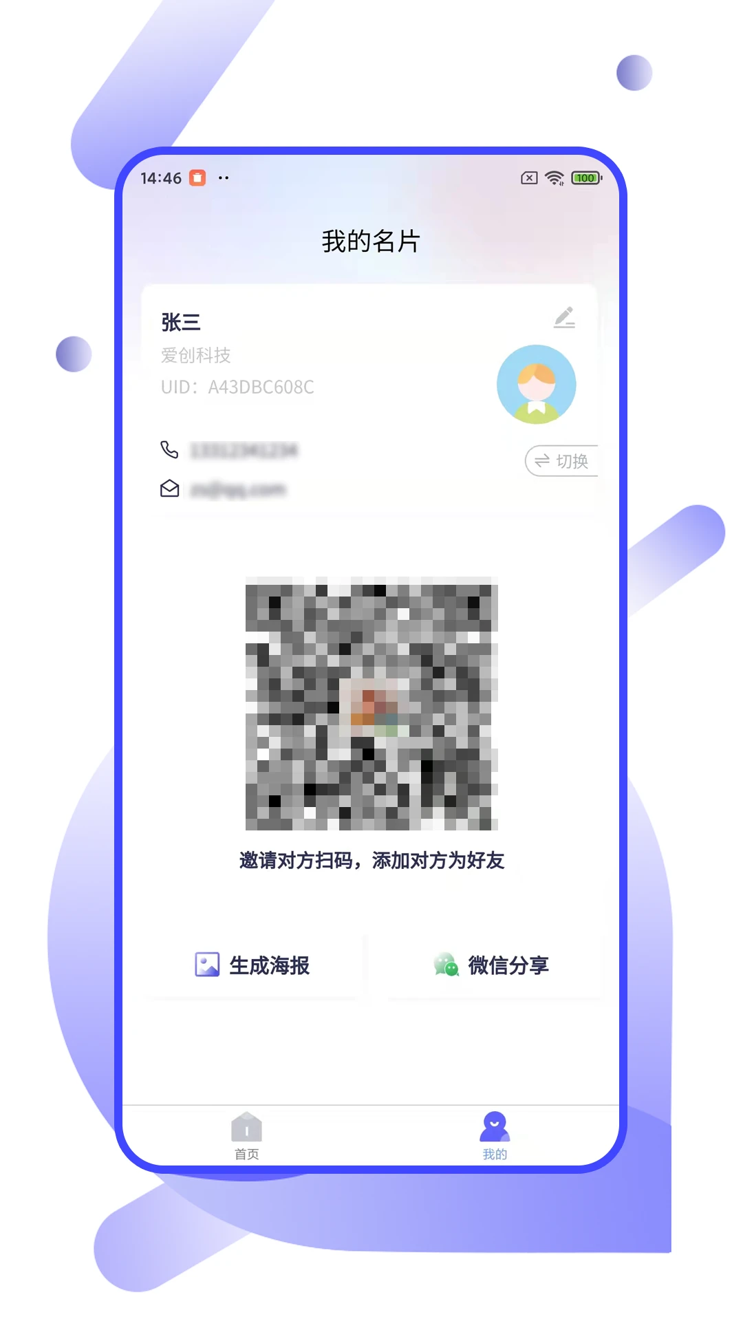 一键生成电子名片,方便在微信、朋友圈等社交平台分享