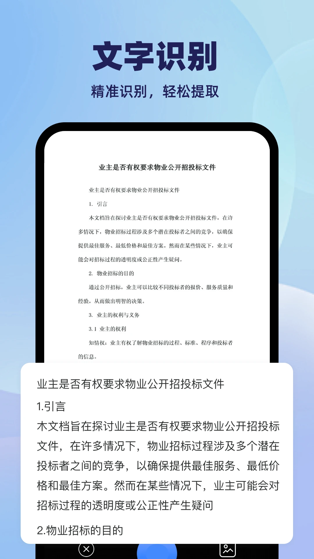 文字识别:支持扫描各类文件、图片、书籍等,精准提取文字内容,并可进行在线编辑和复制。