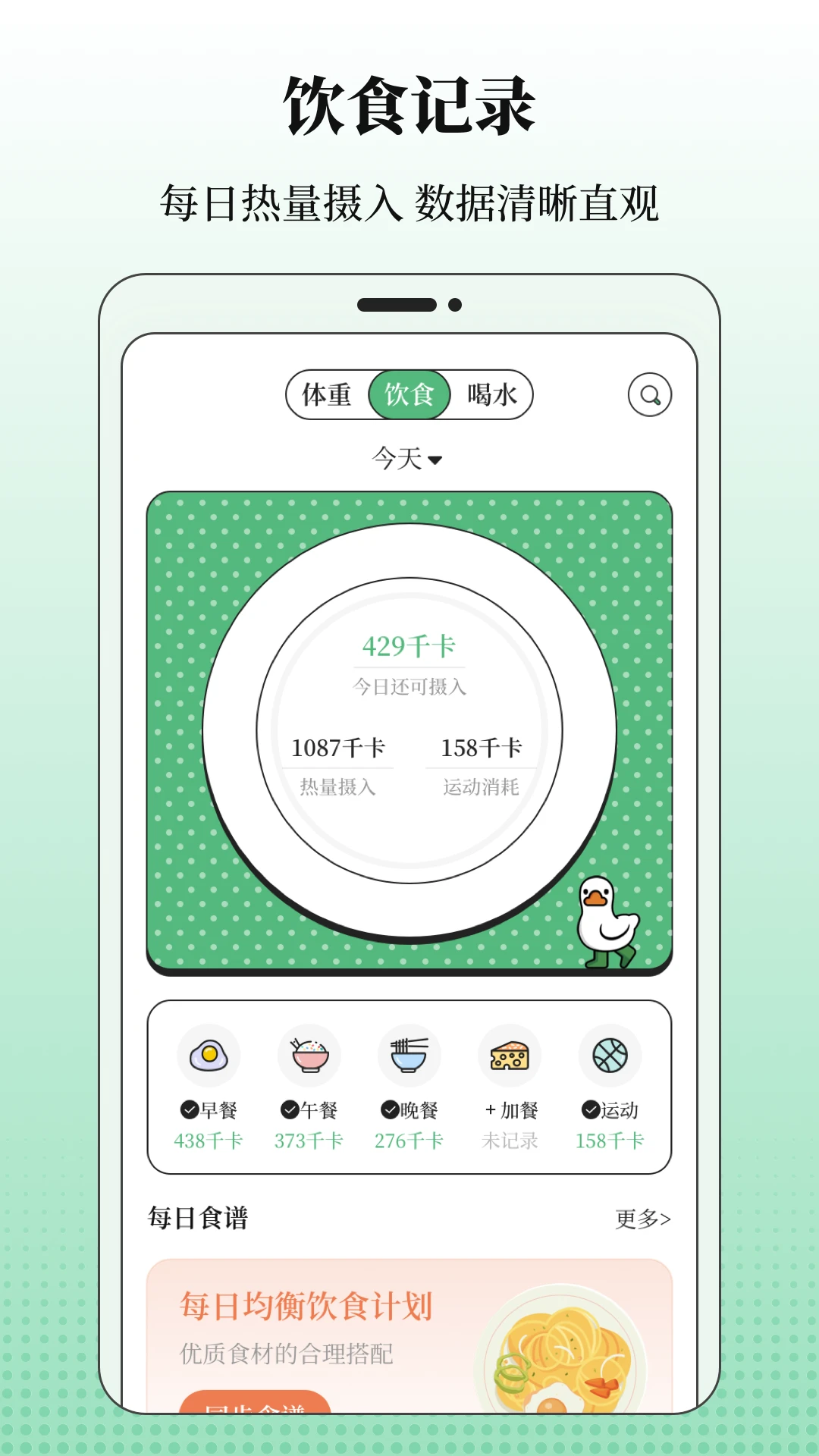 饮食日志功能:拍照记录三餐自动估算卡路里,生成每日营养摄入环形统计图。