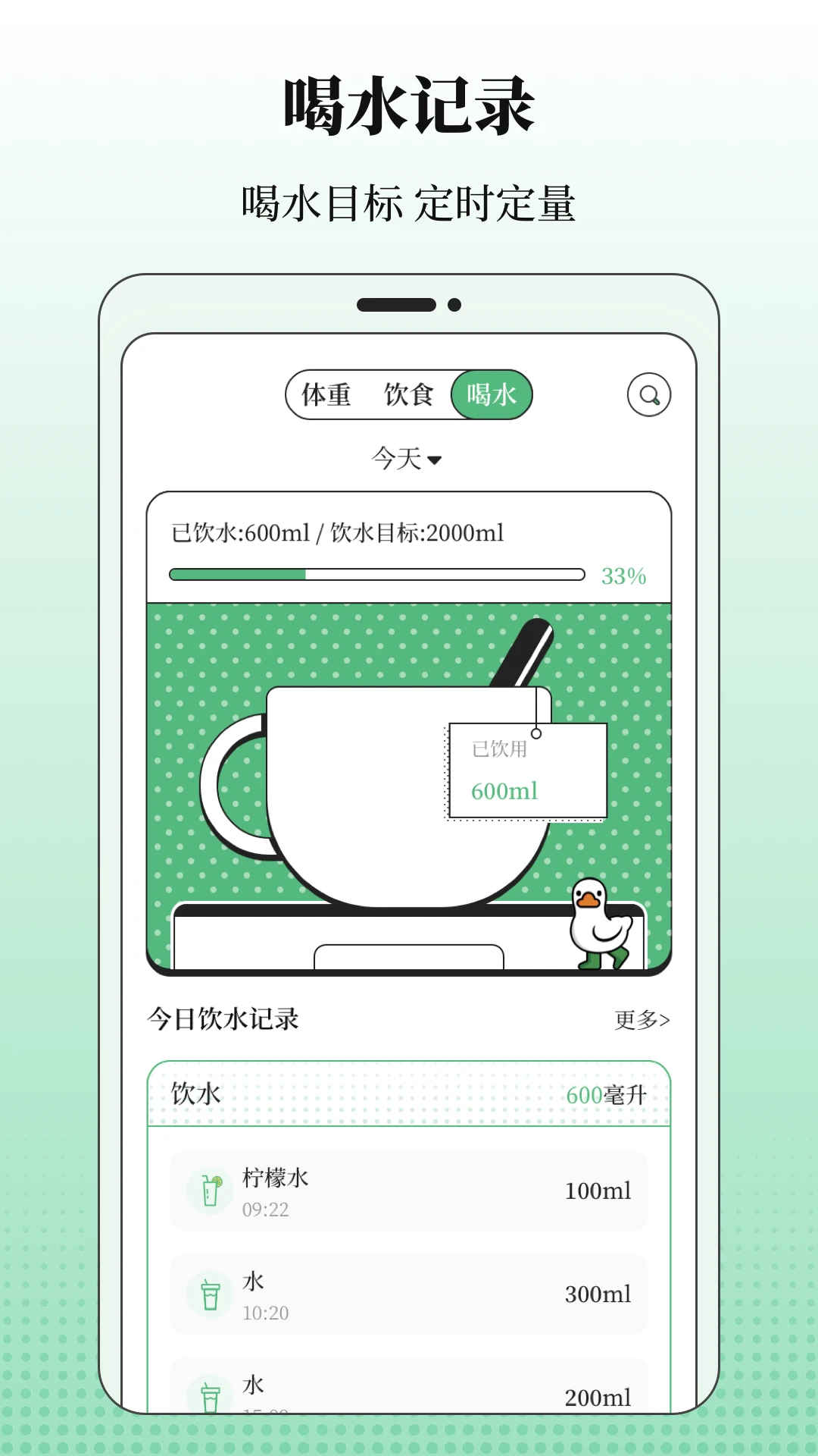 喝水提醒:健康喝水提醒助手,设置每天的饮水量、杯子大小,进行每天喝水打卡提醒,喝水量轻松记录。还有闹钟可设置提醒喝水。