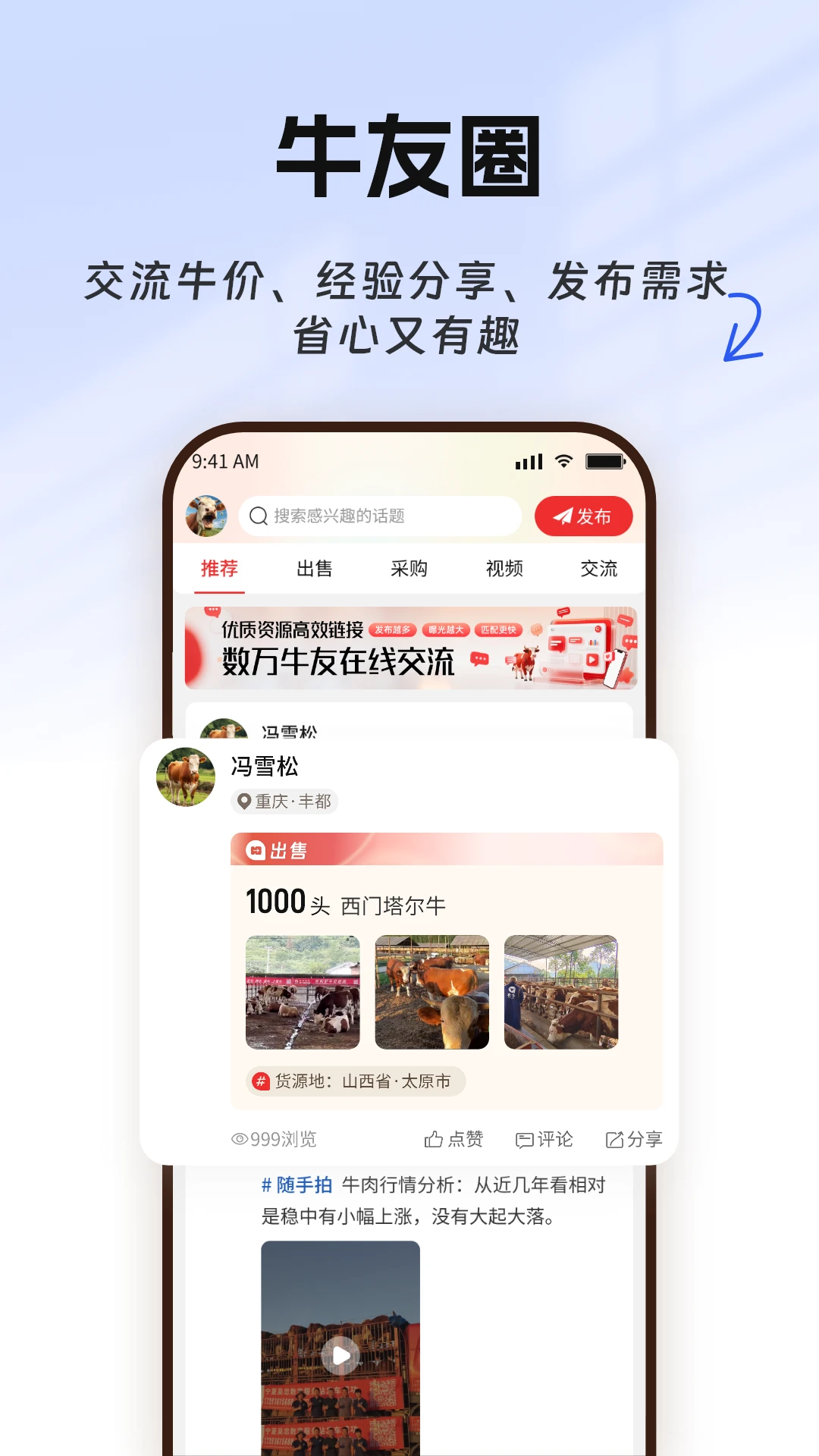 开放互动的肉牛行业交流圈子,牛友间分享养殖经验、交流学习、肉牛买卖需求发布等交流养殖生活趣事。