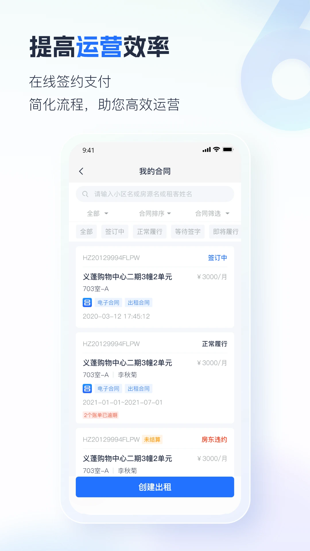 提高运营效率:在线签约、在线支付,减少人力开支,提高运营效率;