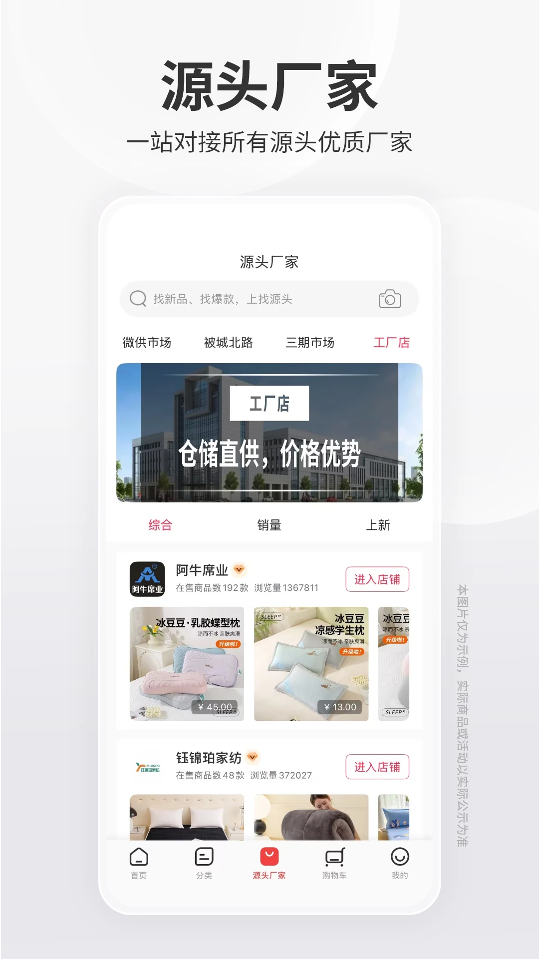 找源头是一款专注于家纺货源分销服务的B2B平台,致力于为家纺行业提供高效便捷的批发解决方案。平台汇聚了海量供货商、经销商以及各类卖家,包括微商、电商、实体店和直播卖家等,满足不同渠道的进货需求。通过视频找货、以图找款等智能功能,用户可以快速匹配心仪产品,并支持一键铺货至15个平台,实现高效分销。无论是小批量采购还是一件起批,找源头都能提供灵活的服务,帮助卖家轻松进货,抢占市场先机。