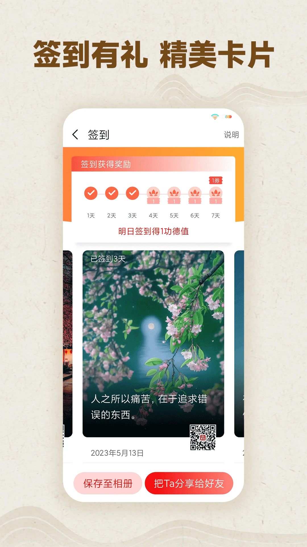 6、签到:签到有礼,每日精美小贺卡;