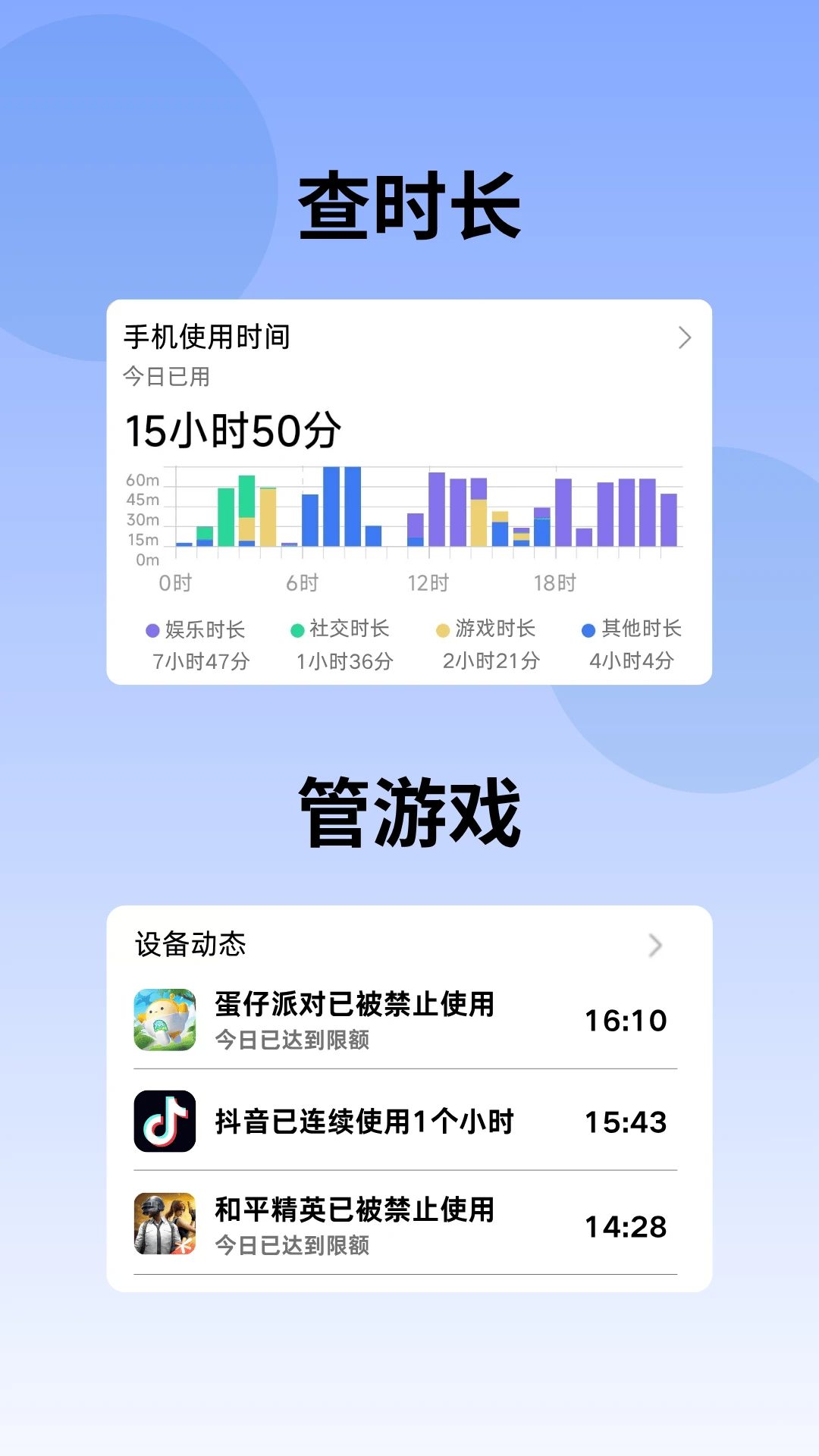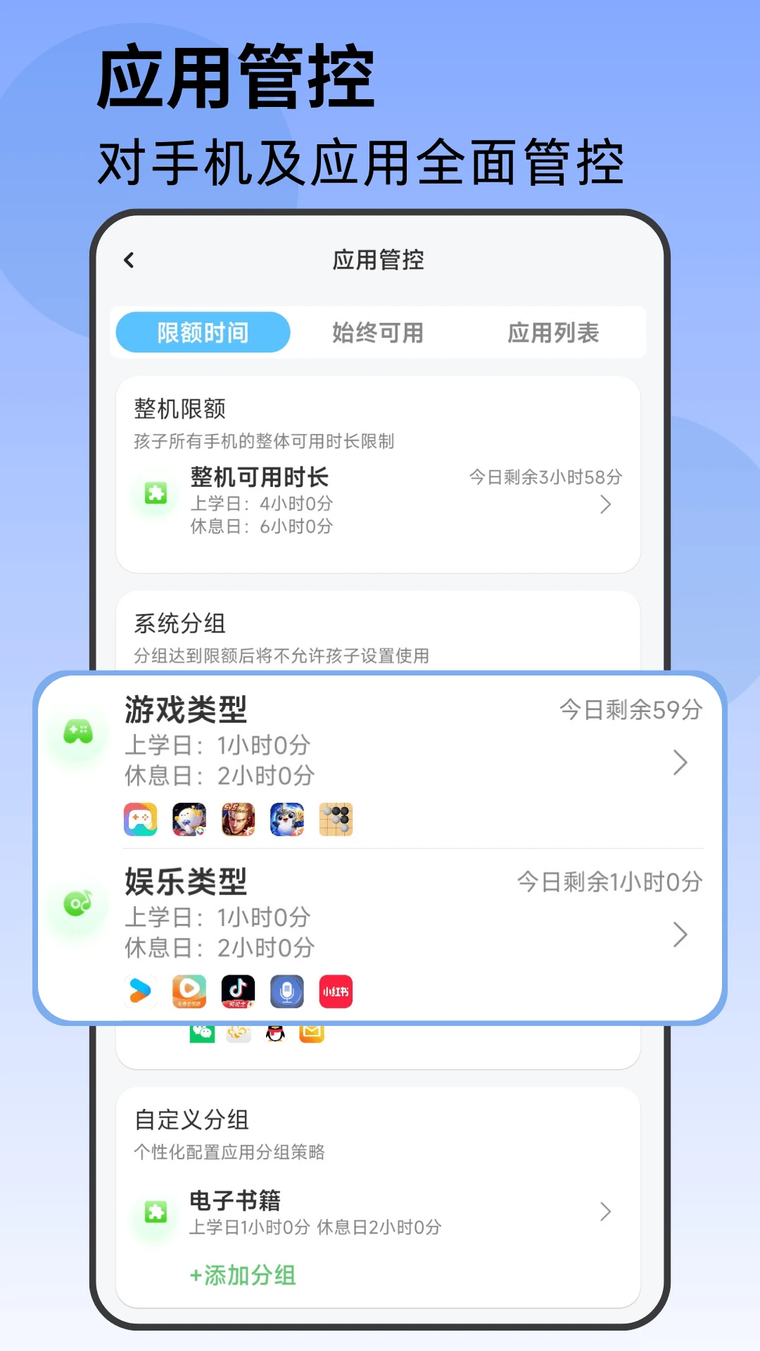 应用管控:与孩子共同制定个性化管控方案,对不同的应用组合设置可用时间,培养孩子自主管理意识。