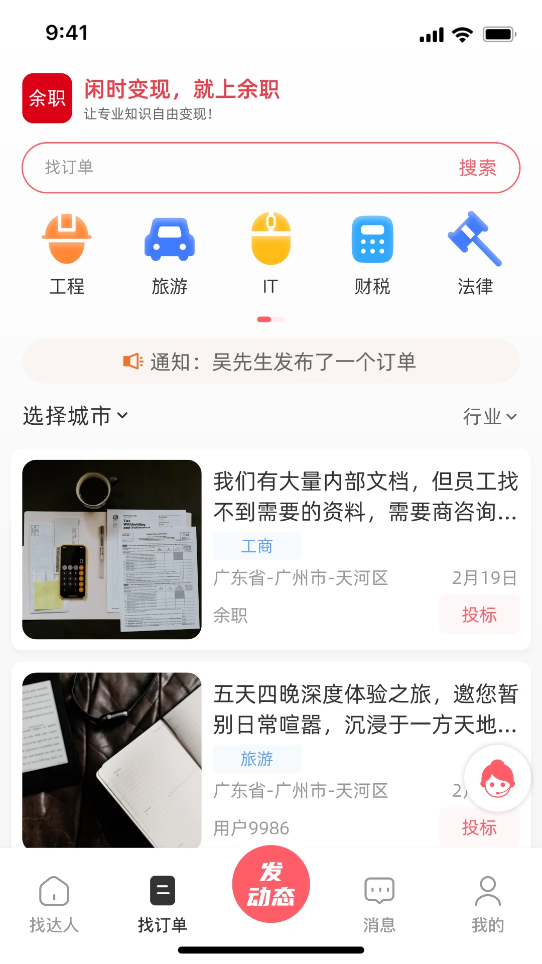 让专业知识自由变现,让就业更加自由,随时随地找到专业的人做专业的事!无论你是身怀绝技的职场达人,还是拥有一技之长的斜杠青年,都能在这里精准匹配需求,把碎片时间转化为实际收益。企业也能快速对接优质人才,高效解决项目难题。灵活接单,轻松创收,余职,为你的职业价值开辟全新可能!