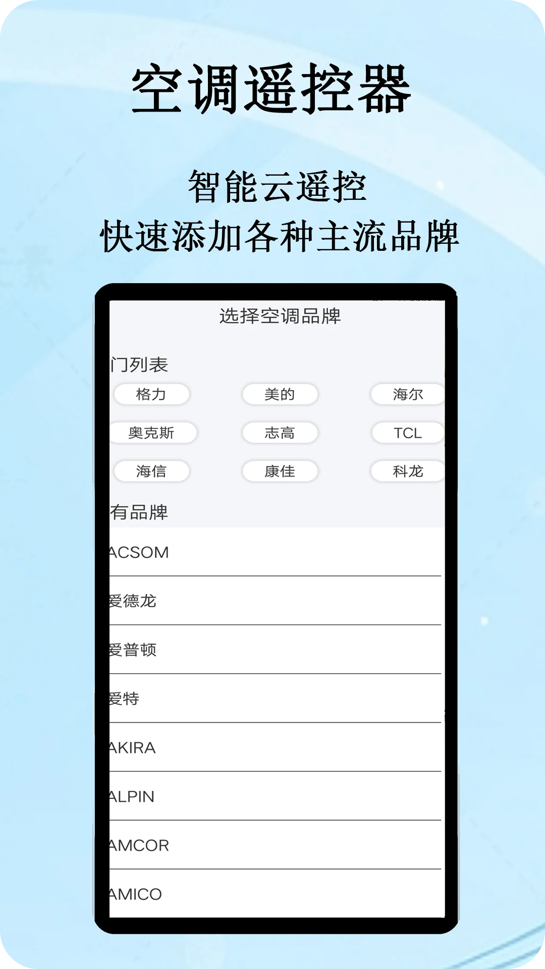 一款支持空调,电视,机顶盒,网络盒子,DVD,投影仪等多种电器,是真正的手机遥控器.支持各种品牌空调,内置遥控器码库,人性化智能搜索遥控器,支持快速添加、编辑、删除、切换、排序,输入电器品牌/型号等关键词即可搜索,再不用对着数十套遥控器数据逐一匹配,WIFI遥控无需对准,快捷方便.