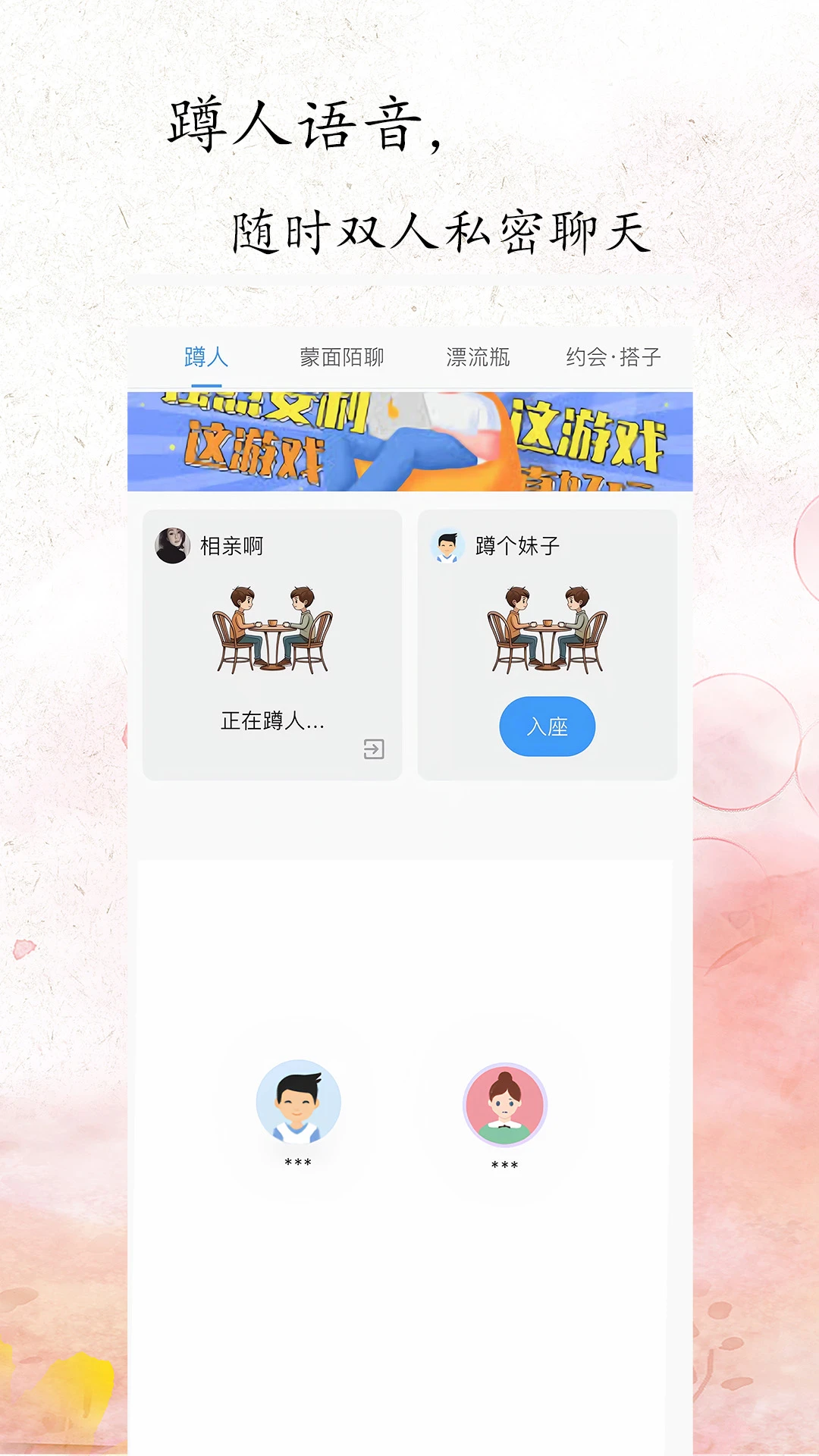 蹲人模式:自由发起或加入即时聊天,高效匹配不打扰,适合倾诉与分享