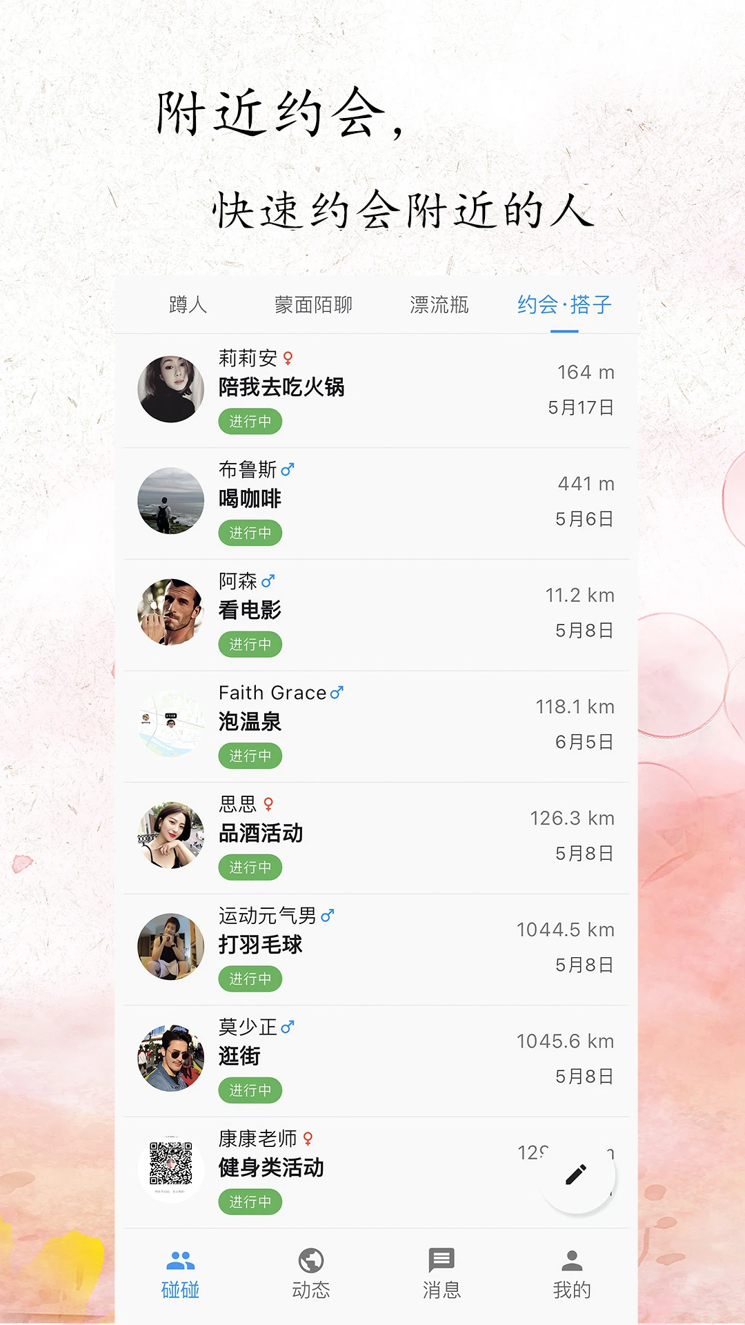 灵活约会:自主发起/参与附近约会,智能推荐兴趣相符活动,打破距离限制