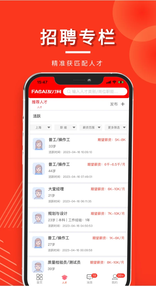 发才网专注互联网招聘求职找工作APP,求职者需要的工作与招聘者发布的岗位精准匹配,秒找工作,秒找人才,发才网日均在线百万岗位,直接沟通,当场拍板,闪电入职,发才网APP发布招聘岗位免费,编写求职简历免费。